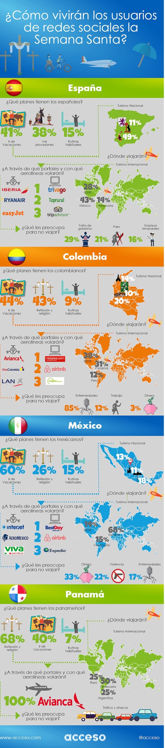 Los principales aspectos comentados por los españoles en las redes sociales ante la Pascua son: vacaciones (41%), procesiones (38%), rutina (15%) y comida (6%), según los datos analizados por Acceso.
